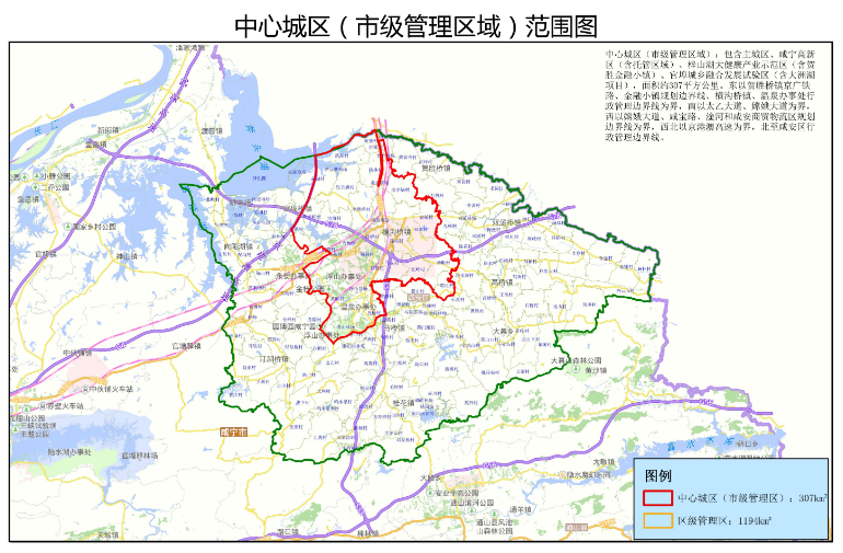 本實(shí)施細(xì)則所稱中心城區(qū),是指市級(jí)管理區(qū)域,包含主城區(qū)、咸寧高新區(qū)(含托管區(qū)域)、梓山湖大健康產(chǎn)業(yè)示范區(qū)(含賀勝金融小鎮(zhèn))、官埠城鄉(xiāng)融合發(fā)展試驗(yàn)區(qū)(含大洲湖項(xiàng)目),面積約307平方公里。東以賀勝橋鎮(zhèn)京廣鐵路、金融小鎮(zhèn)規(guī)劃邊界線、橫溝橋鎮(zhèn)和溫泉街道辦事處行政管理邊界線為界;南以太乙大道、嫦娥大道為界;西以嫦娥大道、咸寶路、淦河和咸安商貿(mào)物流區(qū)規(guī)劃邊界線為界;西北以京港澳高速為界,北至咸安區(qū)行政管理邊界線。(具體范圍見附件)